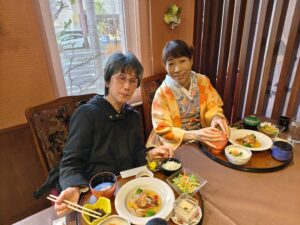 お稽古の後、3級に合格されたHさまと、合格お祝いランチに行きました😍 お友だちも合流されての楽しいひととき…鯛のすり身ハンバーグをいただきました。あんかけでとっても優しい味に大満足😅